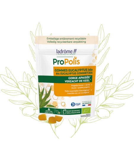 Les gommes BIO Ladrôme à l’eucalyptus radié et aux propolis brune & verte apaisent la gorge, facilitent la respiration et renforcent l’immunité. Une solution naturelle, puissante et douce pour l’hiver.