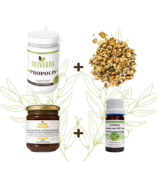 Le Pack « Toux Sèche » Oliverda réunit quatre produits naturels complémentaires pour apaiser la toux sèche, adoucir la gorge et faciliter la respiration : Propolis en gélules, molène sèche, huile essentielle de cyprès toujours vert et miel respiratoire renforcé.